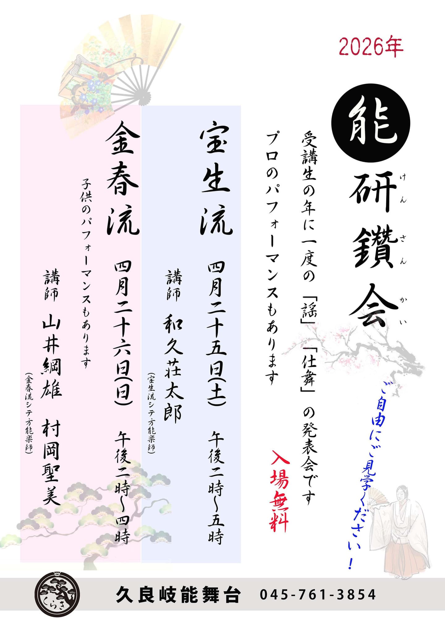 「能」は喜多流、宝生流、金春流の3つの流派に限ります。各流派の講座は曜日、時間帯によって分かれます。詳しい案内は体験大会の時お渡しします。