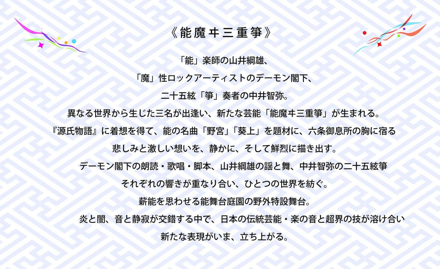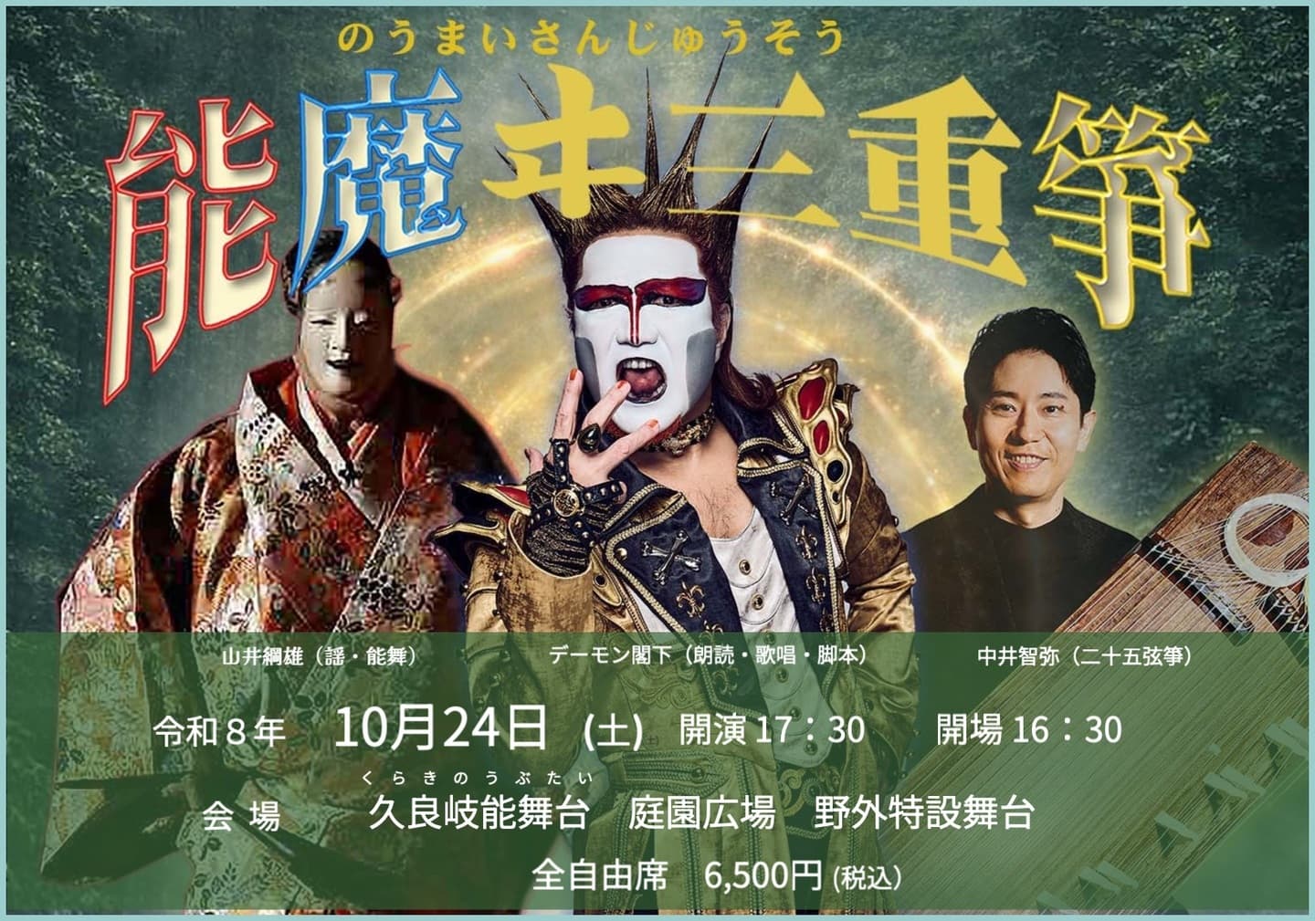 芸術性と娯楽性の融合、そして和の伝統芸能との共創は、約四十年にわたるライフワークである。尺八・三橋貴風氏との主催朗読歌劇「デーモン閣下の邦楽維新Collaboration」は、二十六年目を迎え、上演は九十三回を数える。能楽師・山井綱雄氏とは、津軽三味線・上妻宏光氏との「能舞音楽劇『義経記』」などで共演を重ねてきた。さらに、笛方・一噌幸弘氏との『未来の古典』創作活動「幽玄悪魔」や「冬月能」(豊田能楽堂)など、十年以上にわたり活動を継続している。上海万博では文化交流大使を務め、国際的な舞台にもその活動を広げてきた。広島県がん検診啓発特使、早稲田大学相撲部特別参与、厚生労働省「上手な医療のかかり方」名誉大使など、多方面で社会的役割も担う。地球デビュー四十一年目の本年、Rockな魔楽団・聖飢魔Ⅱは再集結期間を暫定延長。大黒ミサツアー「Season II」を五月から九月にかけ、全国二十カ所で開催する。