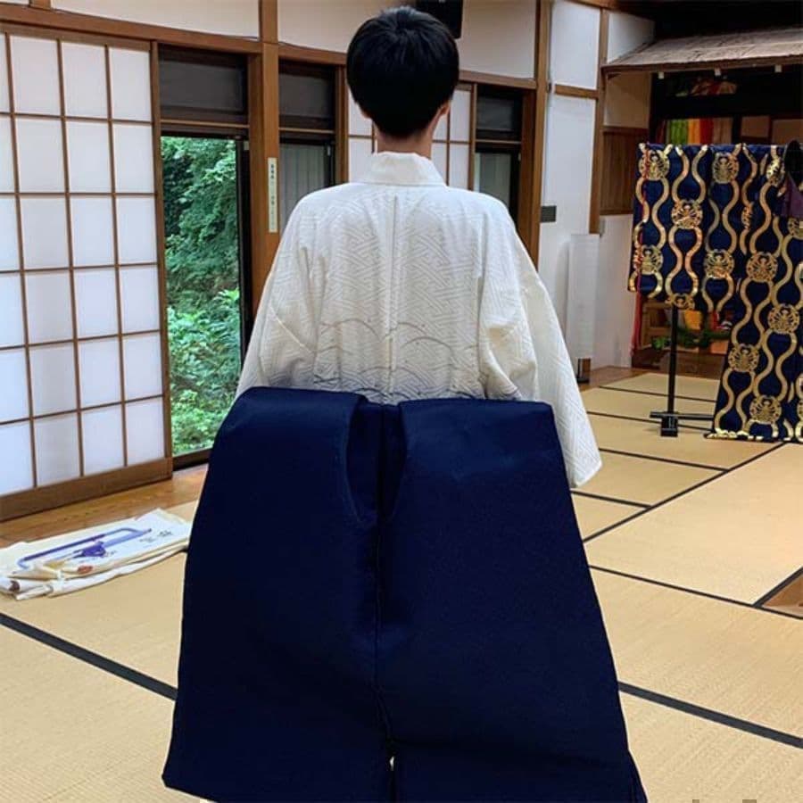 At this event, 2 types of outer garment are available. One is a wide-armed costume called “choken”. It is an elegant dress and is mainly worn by a female role who performs a noh dance. The other one is kariginu. It is a gorgeous costume which a male role of high status wears. Although the materials are silk , our kariginu was weaved in Kyoto with the same technique used for the real one. We also made 2 pairs of hakama, a piece of clothing that covers the lower part of the body. The ohguchi type of hakama, at this opportunity, has very broad hems and is made of firm clothing fabric. You can choose a red or navy-blue hakama, both of which can be adjusted for your height.